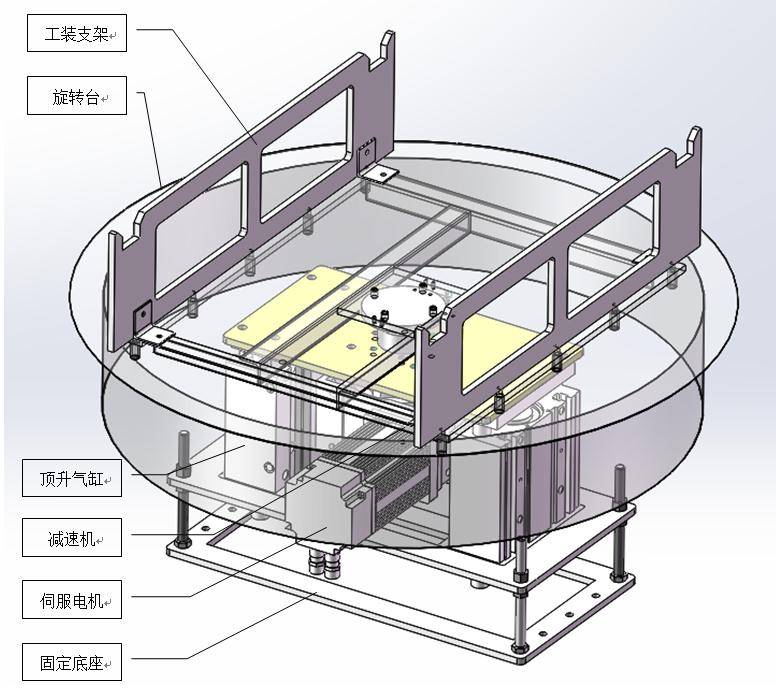DXXZ-00单工位顶升旋转台主要由以下零部件构成:工装支架、顶升气缸、伺服电机、减速机、旋转台、固定底座等。