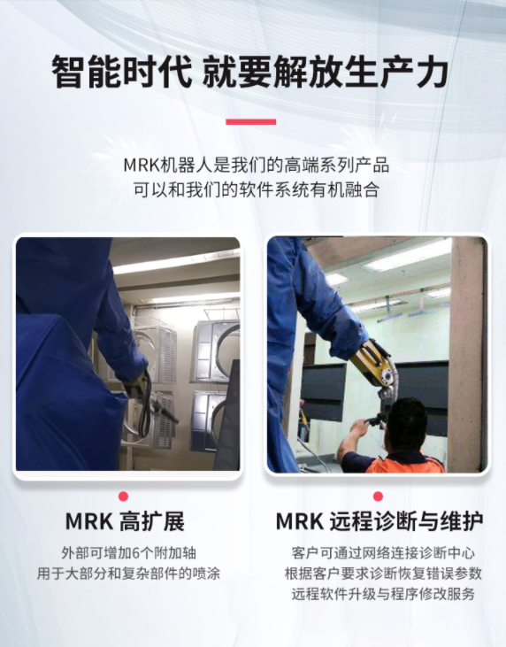 同款的MRK机器人可以选配不同长度的机械臂,能实现对不同尺寸工件的喷涂,同时对喷涂房间做最大化的利用。